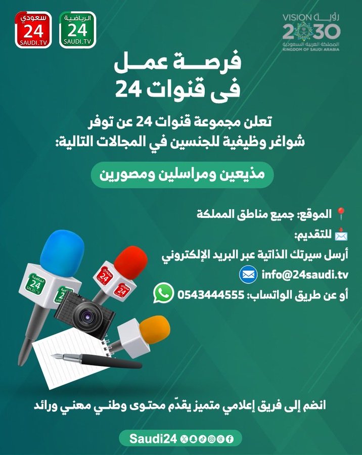 مجالات التوظيف المتاحة في قنوات 24 السعودية (مذيعين – مراسلين – مصورين)